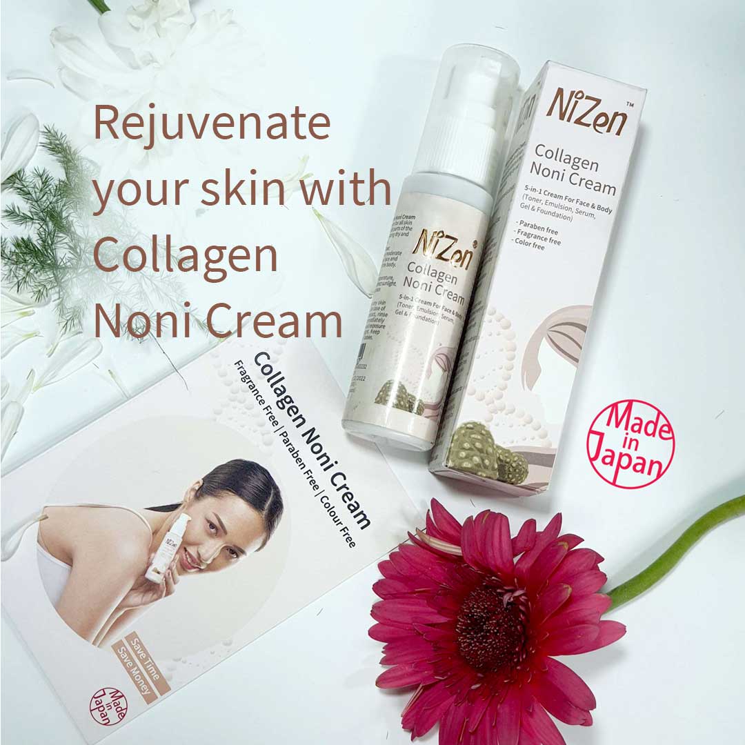 NiZen Collagen Noni Cream is a 100% Japanese natural anti-aging skincare for the face and body. ‘5-in-1 Cream’ (Toner, Emulsifier, Serum, Gel and Foundation). There is no need to buy 5 different products – this beauty product cushions the skin with a protective barrier as it hydrates and soothes. Leaving complexions soft, toned and glowing.